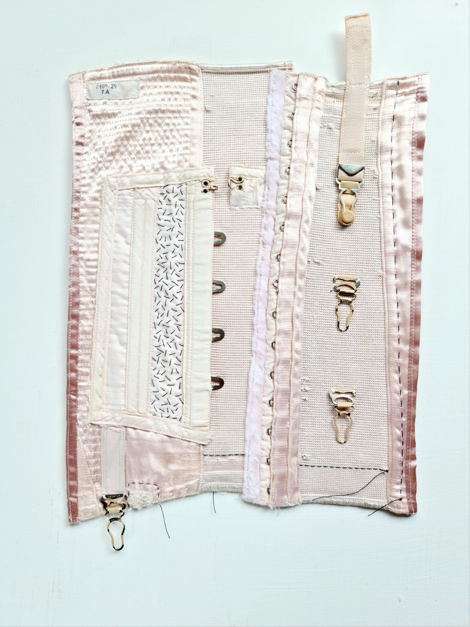 I have deconstructed then reconstructed body shaping undergarments, applied hand & machine stitch to the surface of a fabric that holds the memories of the pain and beauty of woman.